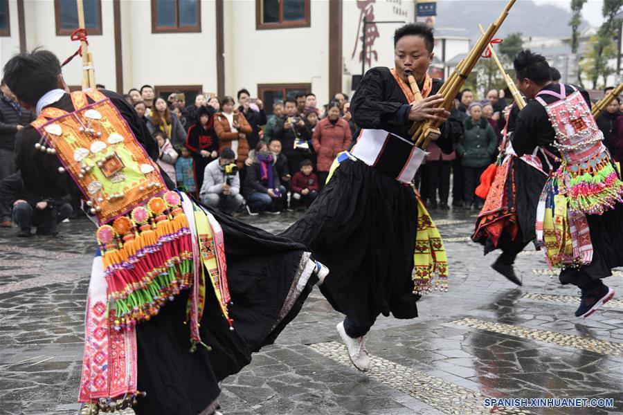 GUIZHOU, febrero 13, 2019 (Xinhua) -- Residentes presentan una danza folclórica, en el condado de Longli en la Prefectura Autónoma Bouyei y Miao de Qiannan, provincia de Guizhou, en el suroeste de China, el 13 de febrero de 2019. (Xinhua/Luo Xianqin)