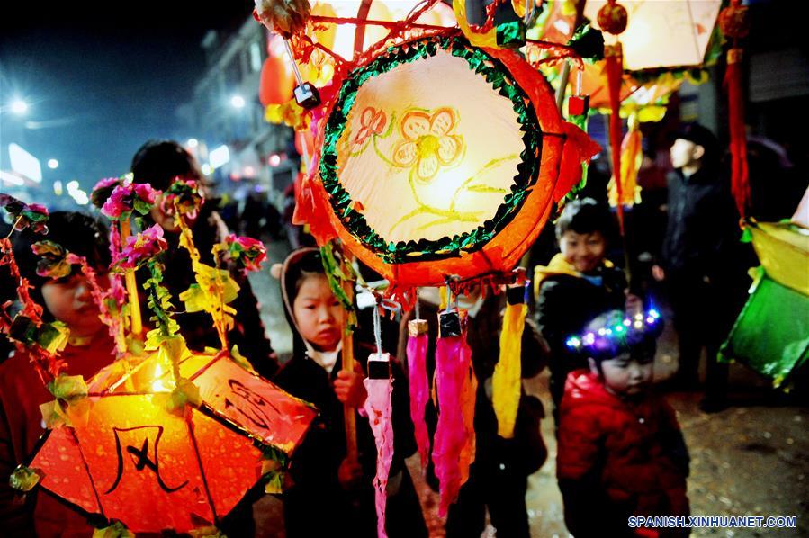 JIANGXI, febrero 13, 2019 (Xinhua) -- Imagen del 12 de febrero de 2019 de ni?os jugando con linternas, en la villa de Zhancai de la ciudad de Dexing, provincia de Jiangxi, en el este de China. (Xinhua/Zhuo Zhongwei)