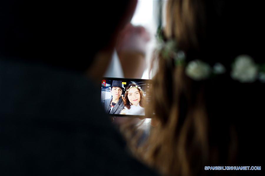 CIUDAD DE MEXICO, febrero 14, 2019 (Xinhua) -- Una pareja se toma una "selfie" durante el evento de bodas ficticias "Cásate en las alturas en el Mirador de la Torre Latino", en el marco de la celebración del Día de San Valentín, en la Ciudad de México, capital de México, el 14 de febrero de 2019. De acuerdo con información de la prensa local, las parejas pueden acudir al piso 44 de la emblemática Torre Latinoamericana y participar en una boda ficticia oficiada por una persona disfrazada como Elvis, donde al final recibirán un certificado no oficial para recordar el evento. (Xinhua/Francisco Ca?edo)