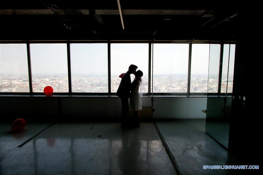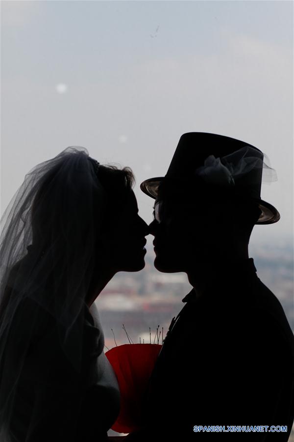 CIUDAD DE MEXICO, febrero 14, 2019 (Xinhua) -- Una pareja participa durante el evento de bodas ficticias "Cásate en las alturas en el Mirador de la Torre Latino", en el marco de la celebración del Día de San Valentín, en la Ciudad de México, capital de México, el 14 de febrero de 2019. De acuerdo con información de la prensa local, las parejas pueden acudir al piso 44 de la emblemática Torre Latinoamericana y participar en una boda ficticia oficiada por una persona disfrazada como Elvis, donde al final recibirán un certificado no oficial para recordar el evento. (Xinhua/Francisco Ca?edo)