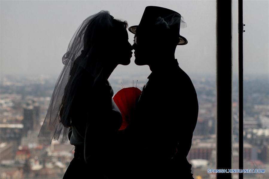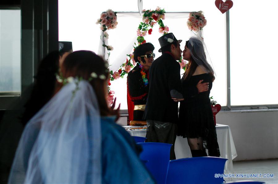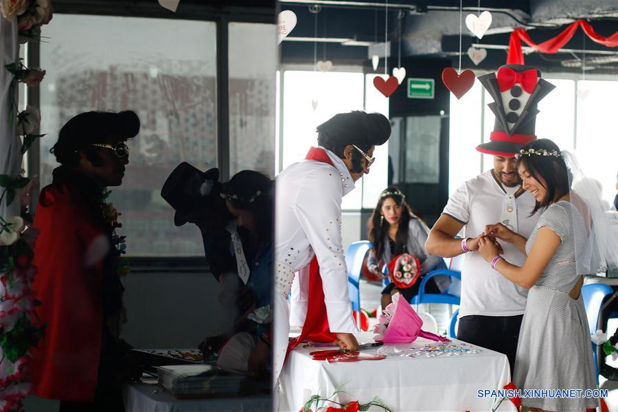 CIUDAD DE MEXICO, febrero 14, 2019 (Xinhua) -- Parejas participan durante el evento de bodas ficticias "Cásate en las alturas en el Mirador de la Torre Latino", en el marco de la celebración del Día de San Valentín, en la Ciudad de México, capital de México, el 14 de febrero de 2019. De acuerdo con información de la prensa local, las parejas pueden acudir al piso 44 de la emblemática Torre Latinoamericana y participar en una boda ficticia oficiada por una persona disfrazada como Elvis, donde al final recibirán un certificado no oficial para recordar el evento. (Xinhua/Francisco Ca?edo)
