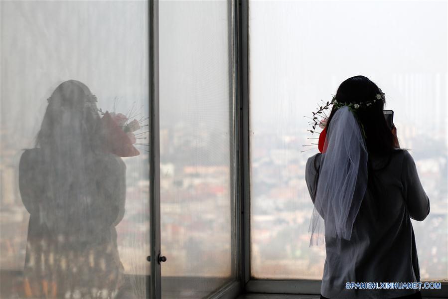 CIUDAD DE MEXICO, febrero 14, 2019 (Xinhua) -- Una joven espera para participar durante el evento de bodas ficticias "Cásate en las alturas en el Mirador de la Torre Latino", en el marco de la celebración del Día de San Valentín, en la Ciudad de México, capital de México, el 14 de febrero de 2019. De acuerdo con información de la prensa local, las parejas pueden acudir al piso 44 de la emblemática Torre Latinoamericana y participar en una boda ficticia oficiada por una persona disfrazada como Elvis, donde al final recibirán un certificado no oficial para recordar el evento. (Xinhua/Francisco Ca?edo)