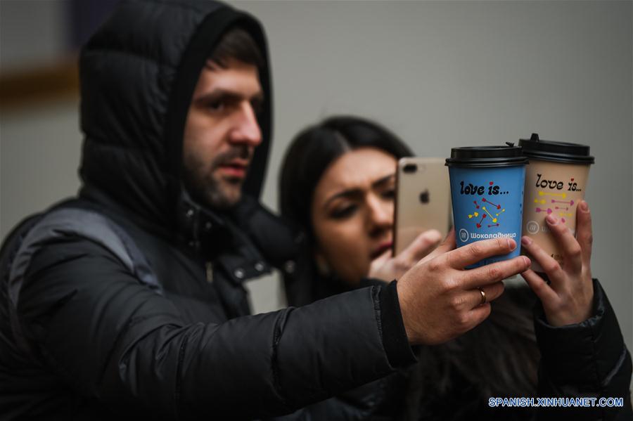MOSCU, febrero 14, 2019 (Xinhua) -- Una pareja toma fotografías de copas con la leyenda "Amor es" durante el Día de San Valentín, en Moscú, Rusia, el 14 de febrero de 2019. (Xinhua/Evgeny Sinitsyn)