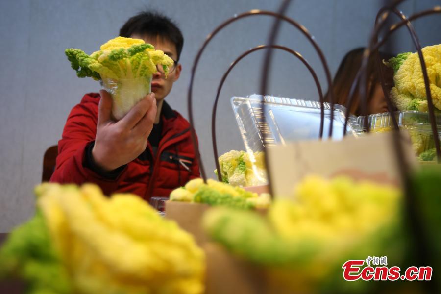 Los estudiantes empaquetan un nuevo tipo de col china, creada por el profesor Hou Xilin en la Facultad de Horticultura de la Universidad Agrícola de Nanjing, el 13 de febrero de 2019. Varios estudiantes han creado una nueva empresa para comercializar en línea y fuera de línea la col china, que es más peque?a en tama?o, tiene forma de rosa y sabe mejor. (Foto: China News Service / Yang Bo)