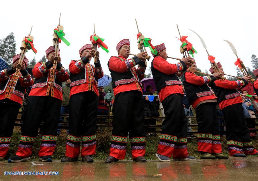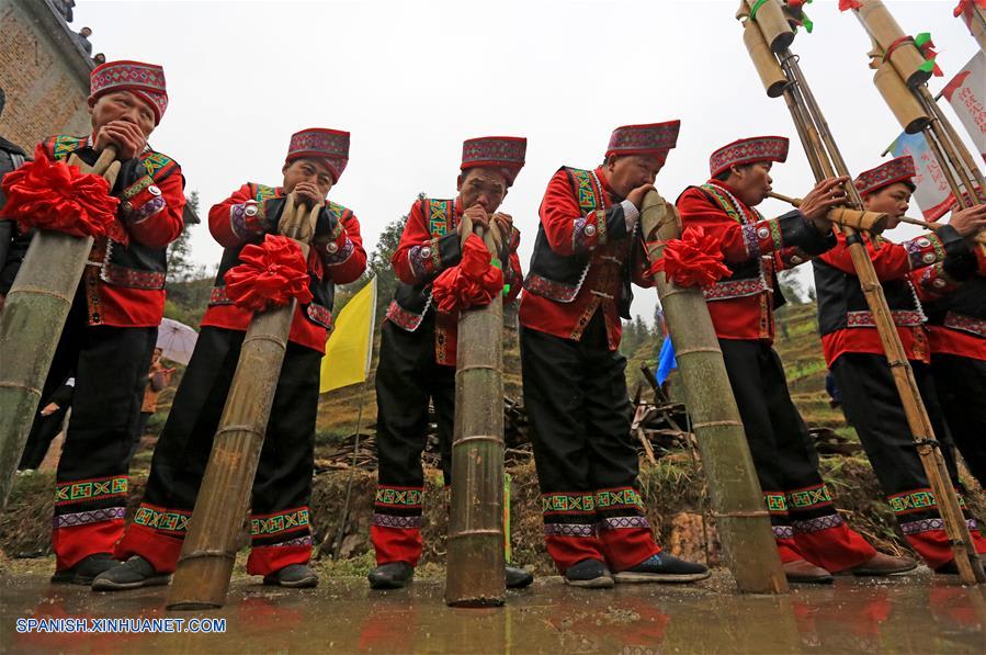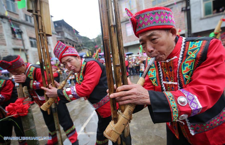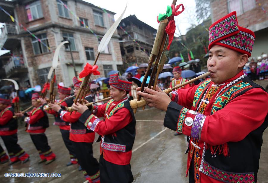 GUANGXI, febrero 15, 2019 (Xinhua) -- Imagen del 14 de febrero de 2019 de personas del grupo étnico Zhuang tocando instrumentos de viento de tubo de ca?a conocidos como Lusheng durante una actividad local llamada "Datongnian", en la villa de Jiangzhu del Condado Autónomo Miao de Rongshui de Liuzhou, en la Región Autónoma Zhuang de Guangxi, en el sur de China. La "Datongnian", es una reunión local en Rongshui durante la cual las personas pueden hacer amigos. (Xinhua/Long Linzhi)