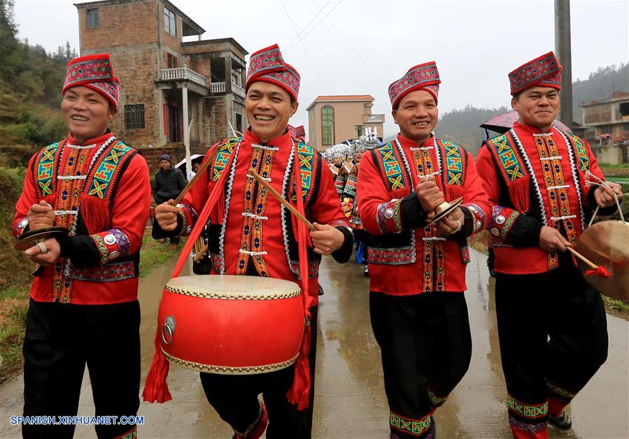 GUANGXI, febrero 15, 2019 (Xinhua) -- Imagen del 14 de febrero de 2019 de personas del grupo étnico Zhuang tocando tambores y gongs durante una actividad local llamada "Datongnian", en la villa de Jiangzhu del Condado Autónomo Miao de Rongshui de Liuzhou, en la Región Autónoma Zhuang de Guangxi, en el sur de China. La "Datongnian", es una reunión local en Rongshui durante la cual las personas pueden hacer amigos. (Xinhua/Long Tao)