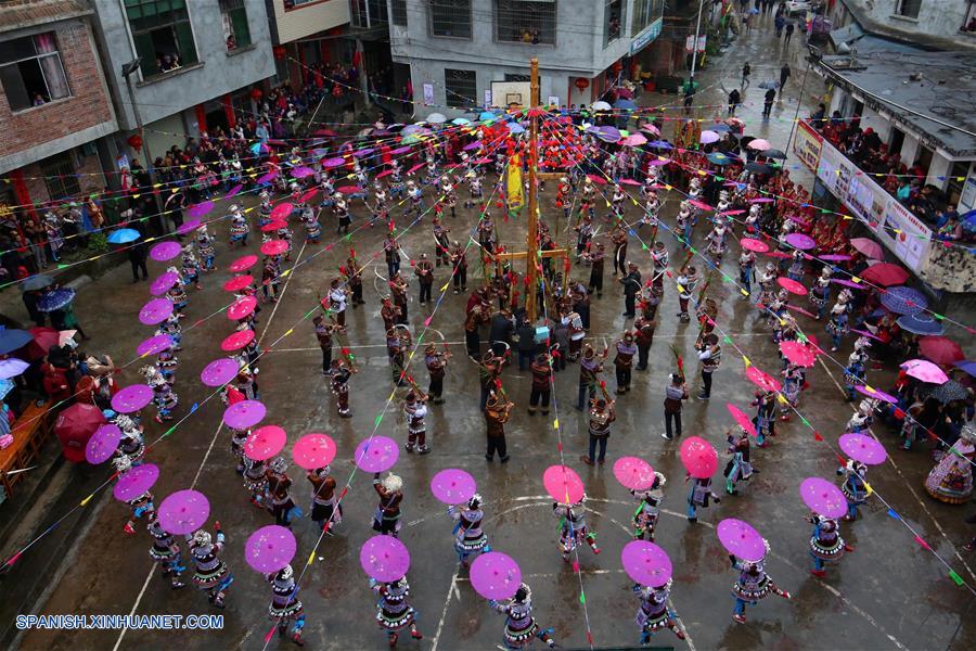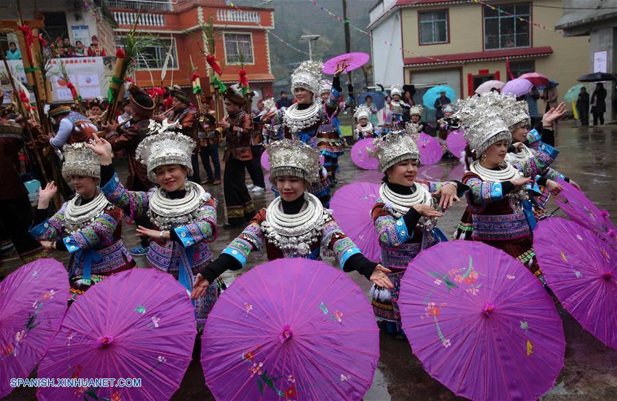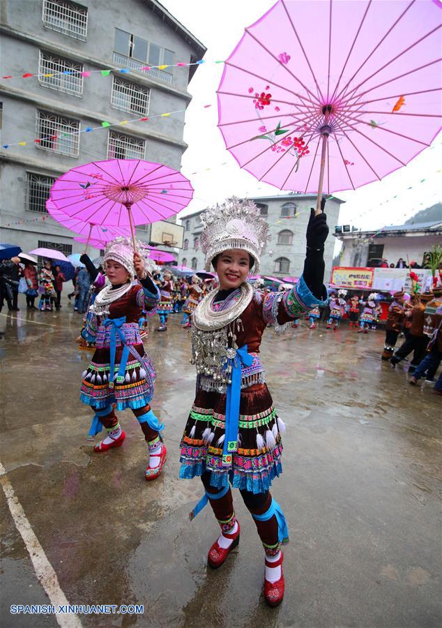GUANGXI, febrero 15, 2019 (Xinhua) -- Imagen del 14 de febrero de 2019 de mujeres del grupo étnico Miao interpretando un baile durante una actividad local llamada "Datongnian", en la villa de Jiangzhu del Condado Autónomo Miao de Rongshui de Liuzhou, en la Región Autónoma Zhuang de Guangxi, en el sur de China. La "Datongnian", es una reunión local en Rongshui durante la cual las personas pueden hacer amigos. (Xinhua/Long Linzhi)