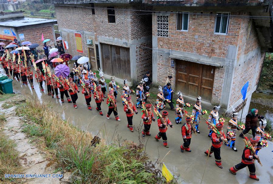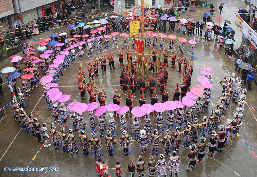 GUANGXI, febrero 15, 2019 (Xinhua) -- Imagen del 14 de febrero de 2019 de residentes asistiendo a una actividad local llamada "Datongnian", en la villa de Jiangzhu del Condado Autónomo Miao de Rongshui de Liuzhou, en la Región Autónoma Zhuang de Guangxi, en el sur de China. La "Datongnian", es una reunión local en Rongshui durante la cual las personas pueden hacer amigos. (Xinhua/Long Tao)