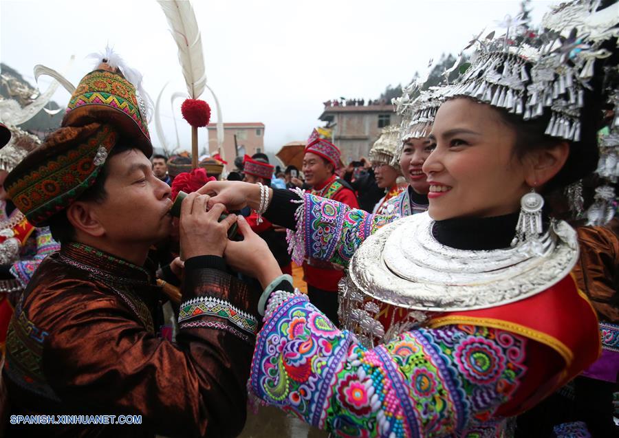 GUANGXI, febrero 15, 2019 (Xinhua) -- Imagen del 14 de febrero de 2019 de personas de los grupos étnicos Miao y Zhuang asistiendo a una actividad local llamada "Datongnian", en la villa de Jiangzhu del Condado Autónomo Miao de Rongshui de Liuzhou, en la Región Autónoma Zhuang de Guangxi, en el sur de China. La "Datongnian", es una reunión local en Rongshui durante la cual las personas pueden hacer amigos. (Xinhua/Long Linzhi)