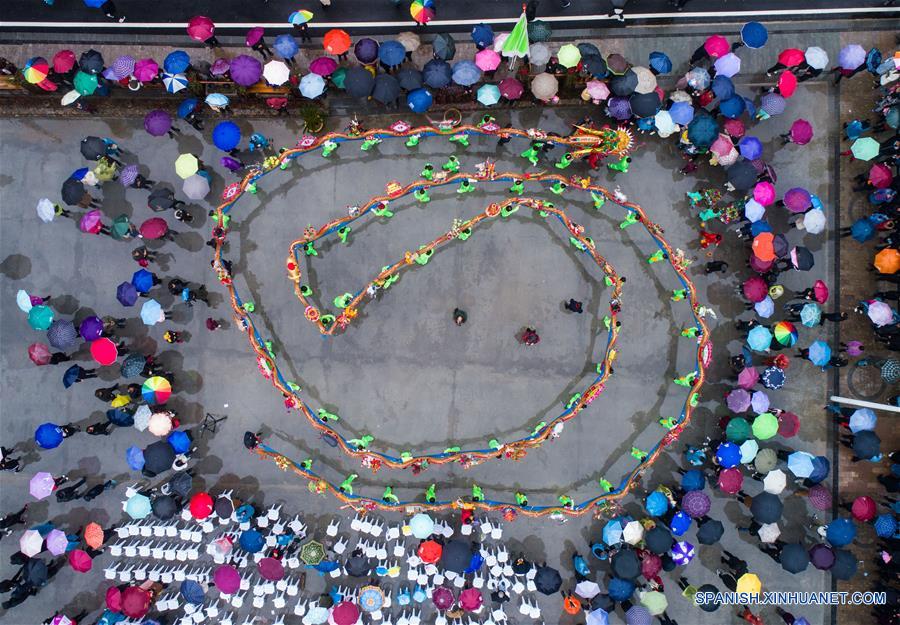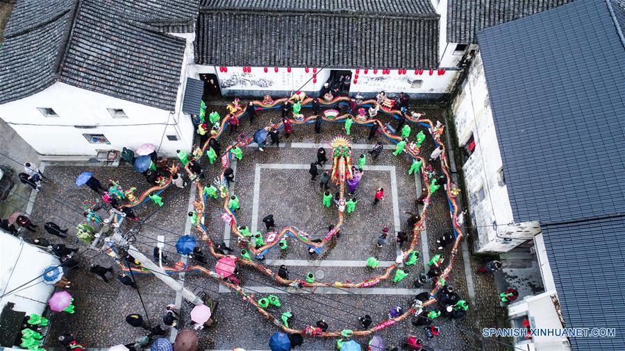 HANGZHOU, febrero 17, 2019 (Xinhua) -- Vista aérea de residentes observando una interpretación de ópera tradicional para celebrar el próximo Festival de la Linterna china, que se celebra el 19 de febrero este a?o, en la villa Yaokou de la municipalidad de Huyuan en Hangzhou, capital de la provincia de Zhejiang, en el este de China, el 17 de febrero de 2019. La villa de Yaokou es famosa por su danza de dragón de bancos de madera, que se origina de la Dinastía Qing (1644-1911). El dragón de bancos de madera tiene una longitud de 130 metros, con 58 bancos de madera unidas entre si, sobre las cuales diversas decoraciones de linterna son instaladas. Las personas se visten con ropajes tradicionales para bailar la danza de dragón de bancos de madera en importantes eventos de festivales para orar por buena fortuna en un a?o nuevo. (Xinhua/Xu Yu)