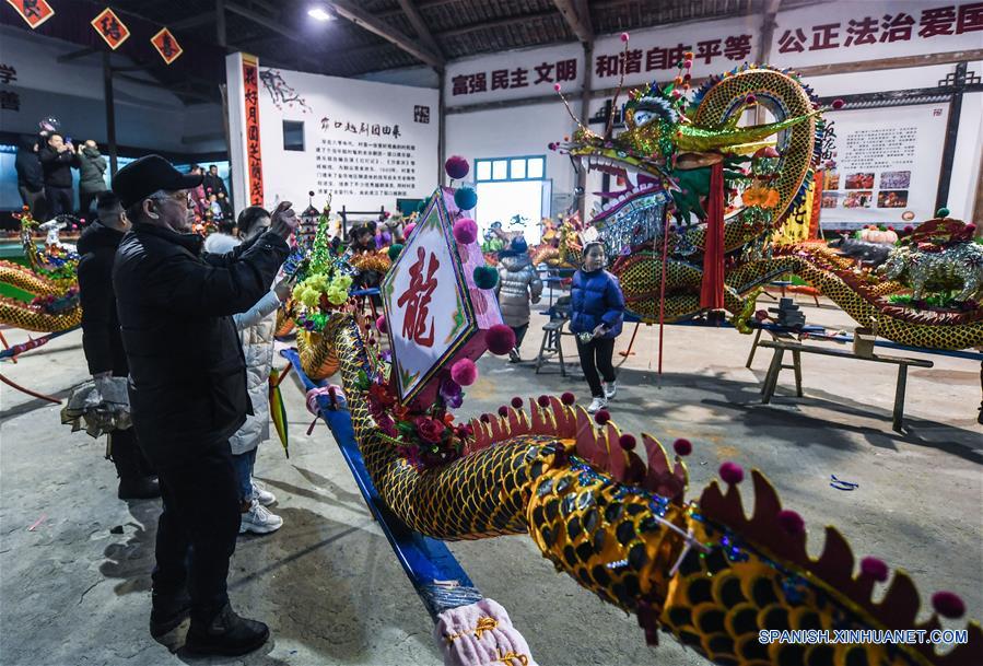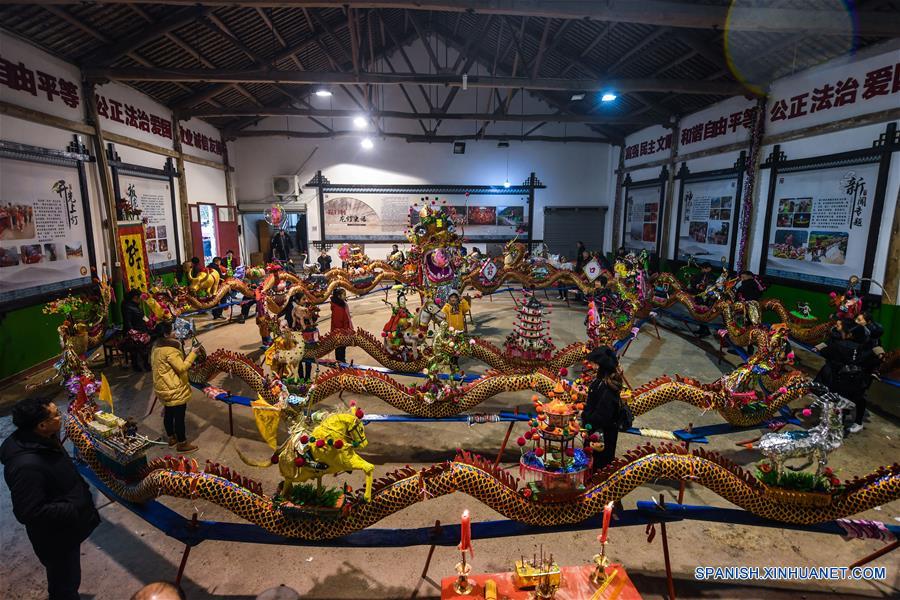 HANGZHOU, febrero 17, 2019 (Xinhua) -- Residentes visitan el dragón de bancos de madera exhibido en el salón de cultura rural en la villa Yaokou de la municipalidad de Huyuan en Hangzhou, capital de la provincia de Zhejiang, en el este de China, el 17 de febrero de 2019. La villa de Yaokou es famosa por su danza de dragón de bancos de madera, que se origina de la Dinastía Qing (1644-1911). El dragón de bancos de madera tiene una longitud de 130 metros, con 58 bancos de madera unidas entre si, sobre las cuales diversas decoraciones de linterna son instaladas. Las personas se visten con ropajes tradicionales para bailar la danza de dragón de bancos de madera en importantes eventos de festivales para orar por buena fortuna en un a?o nuevo. (Xinhua/Xu Yu)