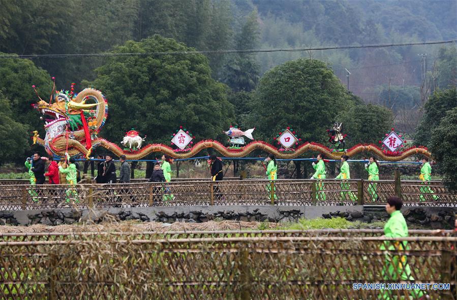 HANGZHOU, febrero 17, 2019 (Xinhua) -- Residentes cargan un dragón de bancos de madera durante un evento para celebrar el próximo Festival de la Linterna china, que se celebra el 19 de febrero este a?o, en la villa Yaokou de la municipalidad de Huyuan en Hangzhou, capital de la provincia de Zhejiang, en el este de China, el 17 de febrero de 2019. La villa de Yaokou es famosa por su danza de dragón de bancos de madera, que se origina de la Dinastía Qing (1644-1911). El dragón de bancos de madera tiene una longitud de 130 metros, con 58 bancos de madera unidas entre si, sobre las cuales diversas decoraciones de linterna son instaladas. Las personas se visten con ropajes tradicionales para bailar la danza de dragón de bancos de madera en importantes eventos de festivales para orar por buena fortuna en un a?o nuevo. (Xinhua/Xu Yu)