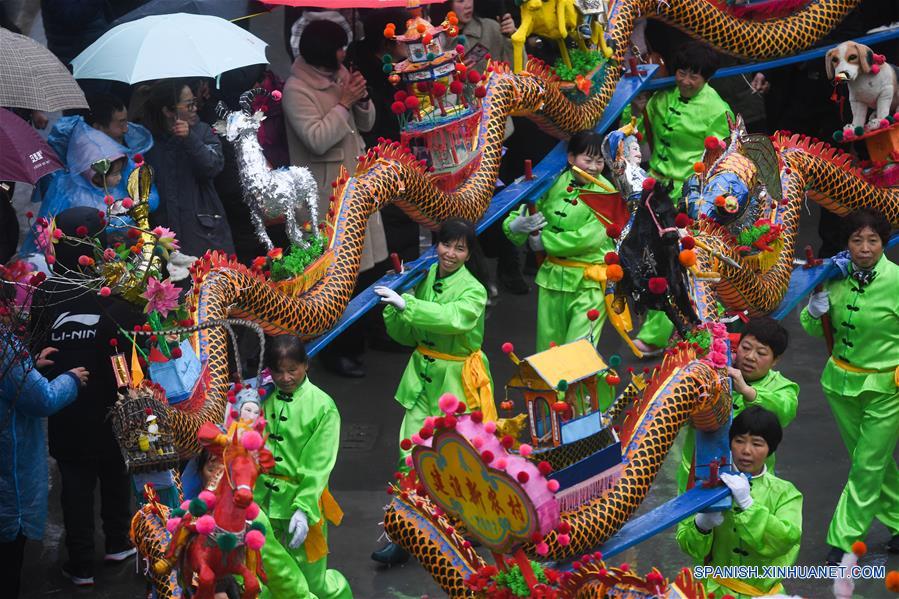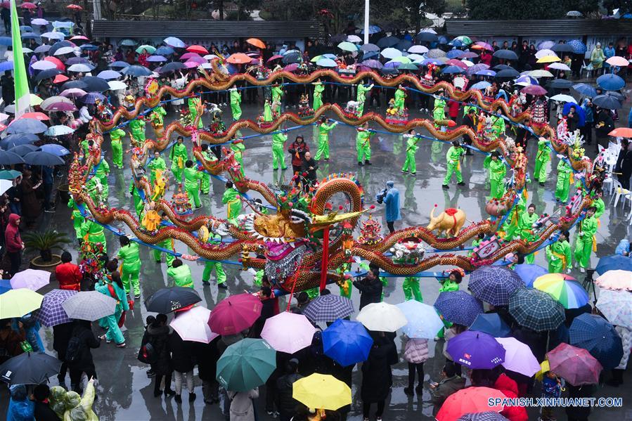 HANGZHOU, febrero 17, 2019 (Xinhua) -- Integrantes de un equipo femenil de baile rural realizan una danza de dragón de bancos de madera durante un evento para celebrar el próximo Festival de la Linterna china, que se celebra el 19 de febrero este a?o, en la villa Yaokou de la municipalidad de Huyuan en Hangzhou, capital de la provincia de Zhejiang, en el este de China, el 17 de febrero de 2019. La villa de Yaokou es famosa por su danza de dragón de bancos de madera, que se origina de la Dinastía Qing (1644-1911). El dragón de bancos de madera tiene una longitud de 130 metros, con 58 bancos de madera unidas entre si, sobre las cuales diversas decoraciones de linterna son instaladas. Las personas se visten con ropajes tradicionales para bailar la danza de dragón de bancos de madera en importantes eventos de festivales para orar por buena fortuna en un a?o nuevo. (Xinhua/Xu Yu)