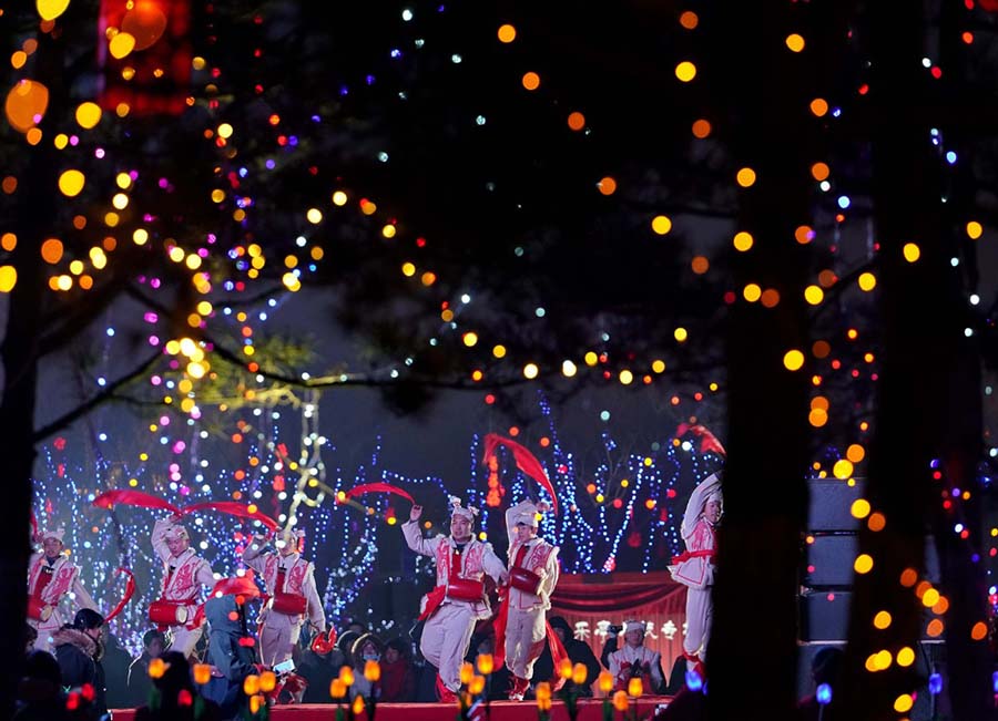 Artistas locales realizan una representación del baile de tambores en el parque Nanhu de Tangshan, provincia de Hebei del norte de China, 15 de febrero de 2019. El Festival de las Linternas se celebra el 19 de febrero este a?o. [Foto / Xinhua]