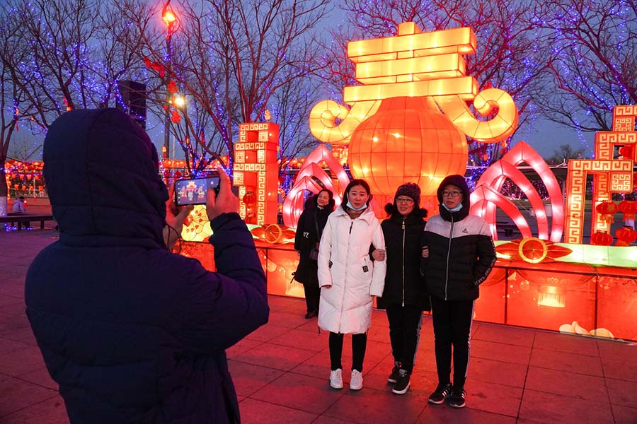 Varias personas se hacen fotos delante de las linternas en el parque Nanhu de Tangshan, provincia de Hebei del norte de China, 15 de febrero de 2019. El Festival de las Linternas se celebra el 19 de febrero este a?o. [Foto / Xinhua]