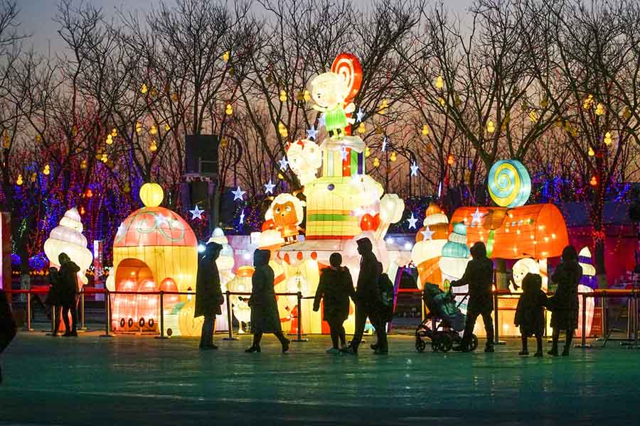Los turistas contemplan las linternas en el parque Nanhu de Tangshan, provincia de Hebei del norte de China, 15 de febrero de 2019. El Festival de las Linternas se celebra el 19 de febrero este a?o. [Foto / Xinhua]