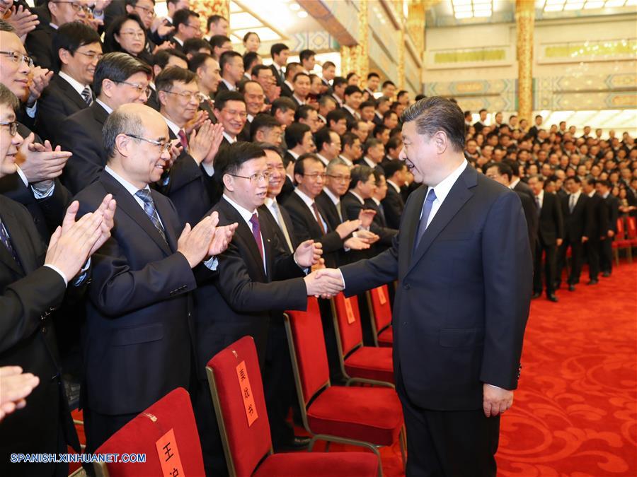 BEIJING, febrero 20, 2019 (Xinhua) -- El presidente chino, Xi Jinping (d-frente), también secretario general del Comité Central del Partido Comunista de China y presidente de la Comisión Militar Central, se reúne con representantes de los científicos e ingenieros espaciales que participaron en la investigación y desarrollo de la misión Chang'e-4 en el Gran Palacio del Pueblo en Beijing, capital de China, el 20 de febrero de 2019. Otros altos líderes incluyendo a Li Keqiang, Li Zhanshu, Wang Yang, Wang Huning, Zhao Leji y Han Zheng también asistieron a la reunión. (Xinhua/Ju Peng)