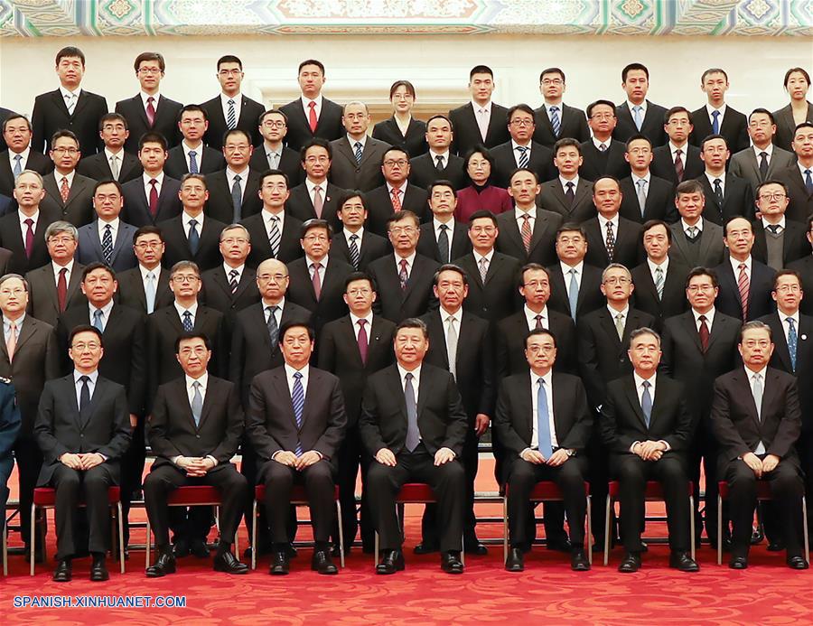 BEIJING, febrero 20, 2019 (Xinhua) -- El presidente chino, Xi Jinping (c-frente), también secretario general del Comité Central del Partido Comunista de China y presidente de la Comisión Militar Central, y otros altos líderes incluyendo a Li Keqiang (3-d-frente), Li Zhanshu (3-i-frente), Wang Yang (2-d-frente), Wang Huning (2-i-frente), Zhao Leji (d-frente) y Han Zheng (i-frente) posan para una fotografía grupal con representantes de los científicos e ingenieros espaciales que participaron en la investigación y desarrollo de la misión Chang'e-4 en el Gran Palacio del Pueblo en Beijing, capital de China, el 20 de febrero de 2019. (Xinhua/Ju Peng)