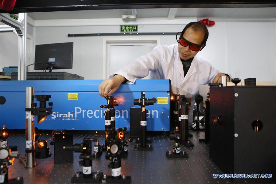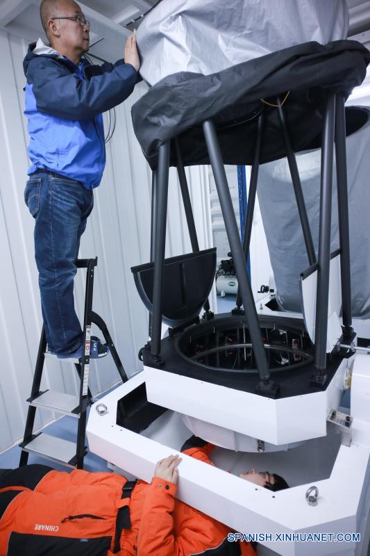 A BORDO DEL XUELONG, febrero 20, 2019 (Xinhua) -- Imagen del 11 de febrero de 2019 de un miembro de la 35 misión de investigación de China en la Antártida ajustando un sistema lidar de fluorescencia Doppler en la Estación Zhongshan, una base de investigación china en la Antártida. Investigadores chinos han instalado y probado un sistema lidar Doppler de fluorescencia en una base de investigación en la Antártida durante una misión que concluyó la semana pasada y ahora se dirigen a casa. El sistema que se ejecuta en la Estación Zhongshan les había permitido observar simultáneamente la temperatura y el campo de viento tridimensional en la mesopausia de la región atmosférica sobre la Antártida, explorando la atmósfera media y superior de la región de la cúspide polar. (Xinhua/Liu Shiping)