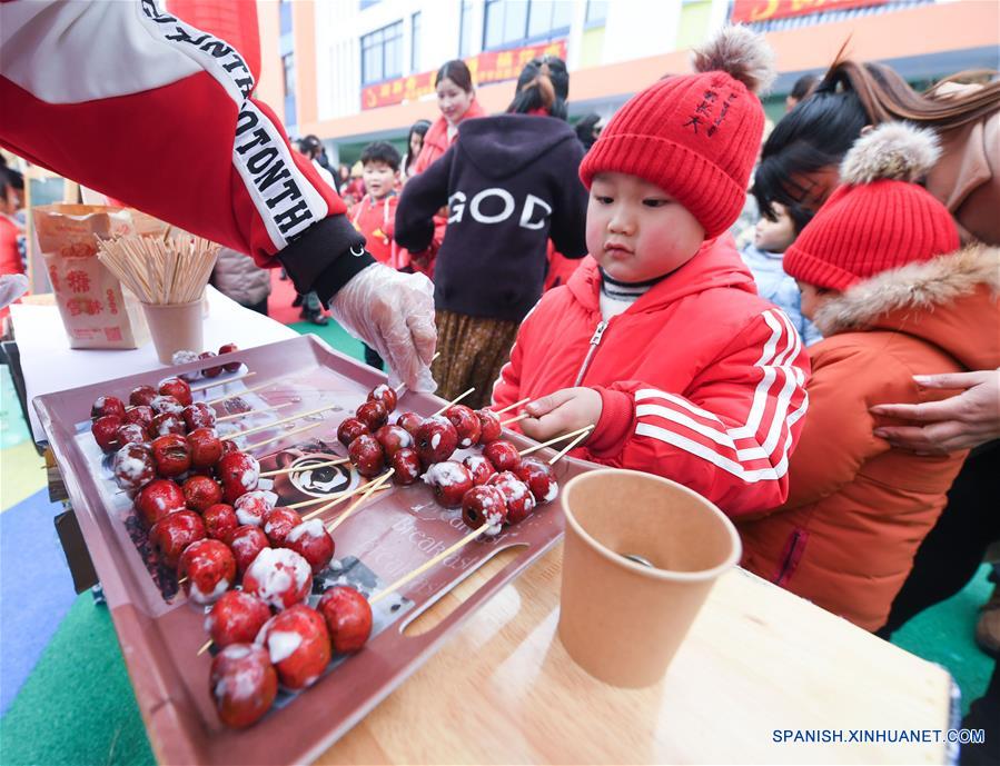 ZHEJIANG, febrero 20, 2019 (Xinhua) -- Un ni?o toma un palo de bayas de espino azucaradas durante una actividad cultural tradicional para comenzar el nuevo semestre en un jardín de ni?os, en el condado de Changxing de la provincia de Zhejiang, en el este de China, el 20 de febrero de 2019. (Xinhua/Xu Yu)