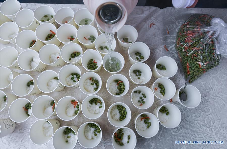 ZHEJIANG, febrero 20, 2019 (Xinhua) -- Una maestra prepara té de soja verde para los ni?os durante una actividad cultural tradicional para comenzar el nuevo semestre en un jardín de ni?os, en el condado de Changxing de la provincia de Zhejiang, en el este de China, el 20 de febrero de 2019. (Xinhua/Xu Yu)