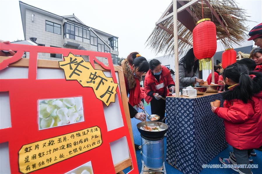 ZHEJIANG, febrero 20, 2019 (Xinhua) -- Maestras preparan galletas de gambas fritas para los ni?os durante una actividad cultural tradicional para comenzar el nuevo semestre en un jardín de ni?os, en el condado de Changxing de la provincia de Zhejiang, en el este de China, el 20 de febrero de 2019. (Xinhua/Xu Yu)