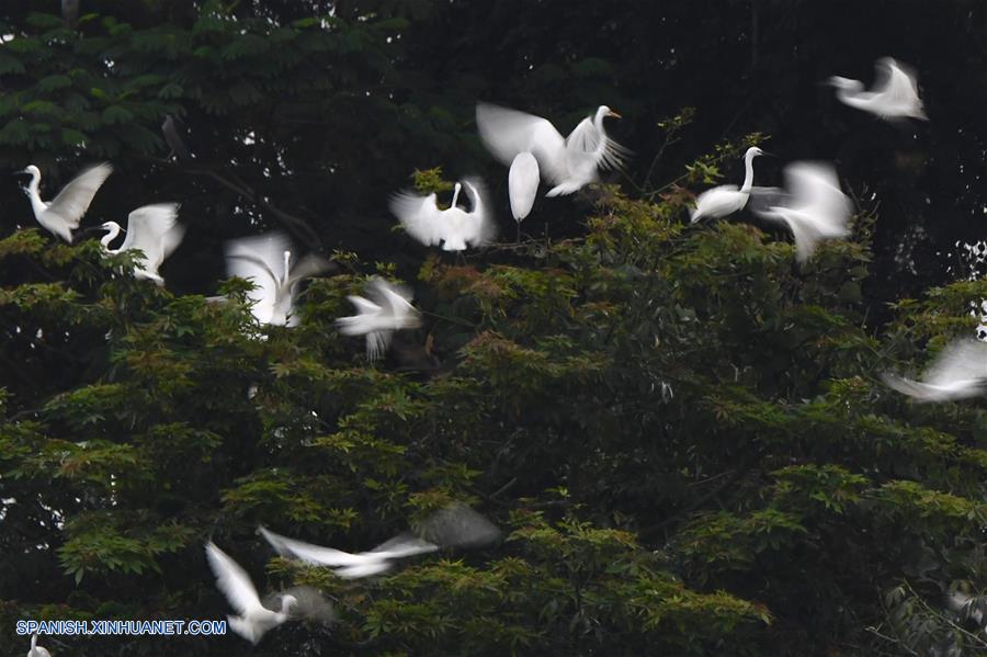 FUJIAN, febrero 22, 2019 (Xinhua) -- Garzas vuelan sobre los árboles en el parque ecológico de Bihu en Zhangzhou, provincia de Fujian, en el sureste de China. (Xinhua/Jiang Kehong)