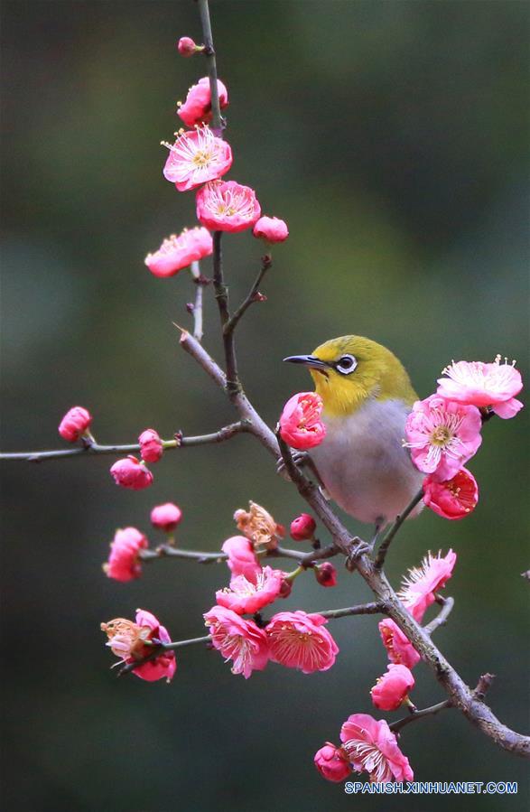 HUNAN, febrero 22, 2019 (Xinhua) -- Un pájaro descansa sobre una rama de ciruelo, en la villa de Wuxing de Hengyang, provincia de Hunan, en el centro de China, el 22 de febrero de 2019. (Xinhua/Cao Zhengping)
