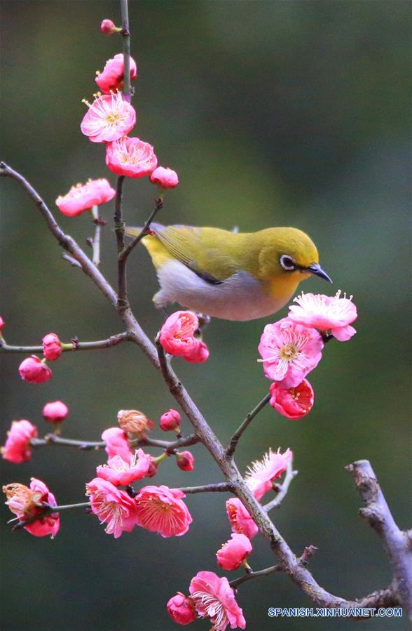 HUNAN, febrero 22, 2019 (Xinhua) -- Un pájaro descansa sobre una rama de ciruelo, en la villa de Wuxing de Hengyang, provincia de Hunan, en el centro de China, el 22 de febrero de 2019. (Xinhua/Cao Zhengping)