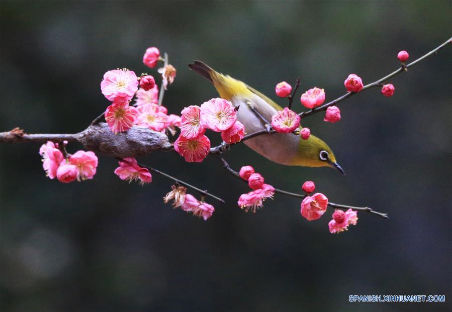 HUNAN, febrero 22, 2019 (Xinhua) -- Un pájaro descansa sobre una rama de ciruelo, en la villa de Wuxing de Hengyang, provincia de Hunan, en el centro de China, el 22 de febrero de 2019. (Xinhua/Cao Zhengping)