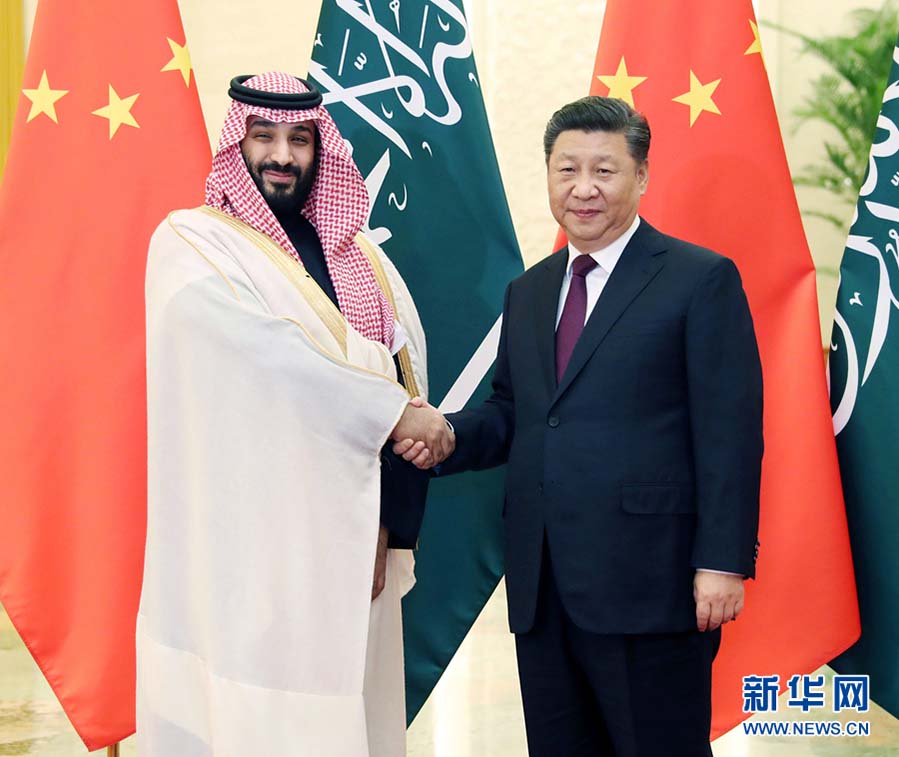 El presidente chino, Xi Jinping (d), se reúne con Mohammed bin Salman Al Saud, príncipe heredero de Arabia Saudí, en el Gran Palacio del Pueblo en Beijing, capital de China, el 22 de febrero de 2019. (Xinhua/Liu Weibing)