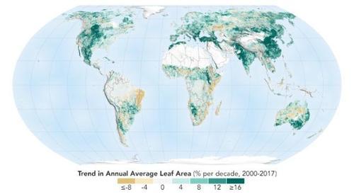 Un nuevo estudio que utiliza datos de satélites de la NASA muestra que China e India están liderando el aumento de la ecologización en la tierra y concluyen que "el efecto proviene principalmente de los ambiciosos programas de plantación de árboles en China y de la agricultura intensiva en ambos países". El estudio fue publicado el 11 de febrero en la revista Nature Sustainability.