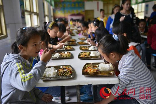 Estudiantes de la escuela primaria comen un "almuerzo gratis" proporcionado por el proyecto de alimentación escolar en Guizhou. [Foto / Pueblo en Línea]