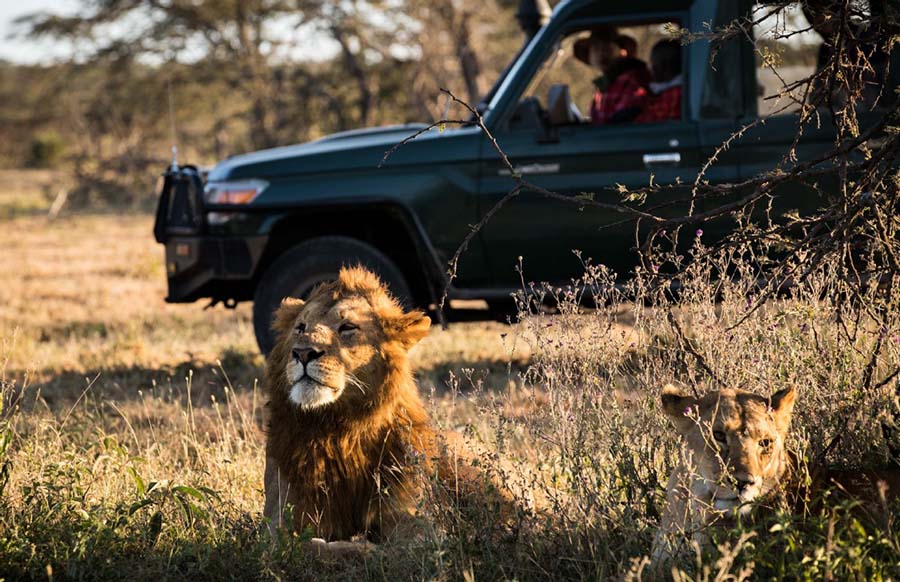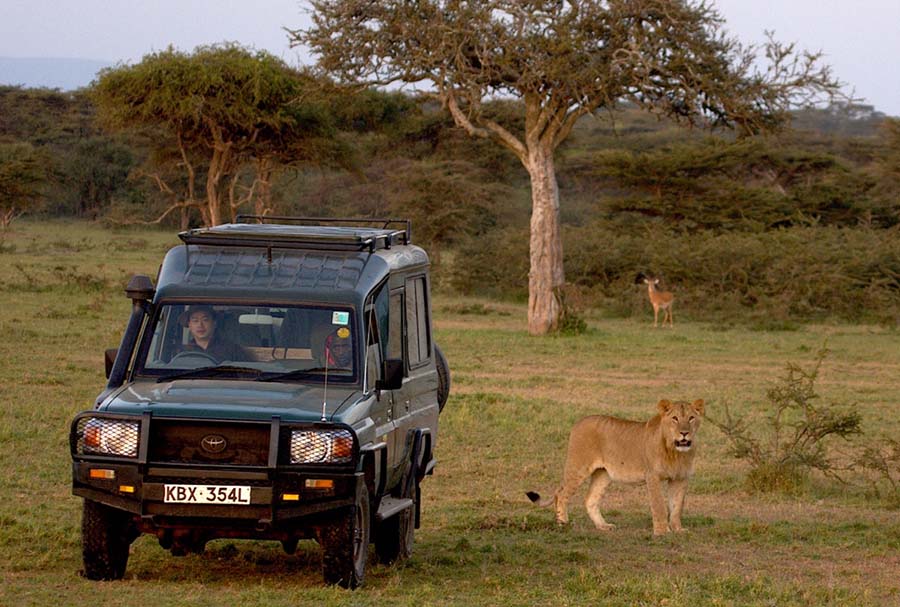 Dos leones descansan en los arbustos de la Reserva Ol Kinyei en la Reserva Nacional de Masai Mara de Kenia, donde el conservacionista de vida silvestre chino Zhuo Qiang (en el automóvil) ha vivido y trabajado desde 2011. [Foto proporcionada a China Daily]