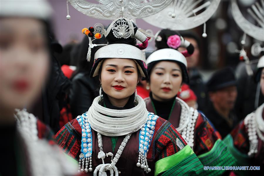 GUIZHOU, febrero 24, 2019 (Xinhua) -- Personas del grupo étnico miao realizan la danza del lusheng en la aldea de Zhouxi, ciudad de Kali, provincia de Guizhou, en el suroeste de China, el 24 de febrero de 2019. Ni?as del grupo étnico miao portando atuendos bordados y ornamentos de plata, cantan y bailan al ritmo del lusheng, un instrumento de tubo de ca?a, para pedir por la buena fortuna. Las personas del grupo étnico miao se reúnen en Gannangxiang para el festejo anual del Gannangxiang, una de las celebraciones de lusheng más grandes y primitivas en la provincia de Guizhou. (Xinhua/Yang Wenbin)