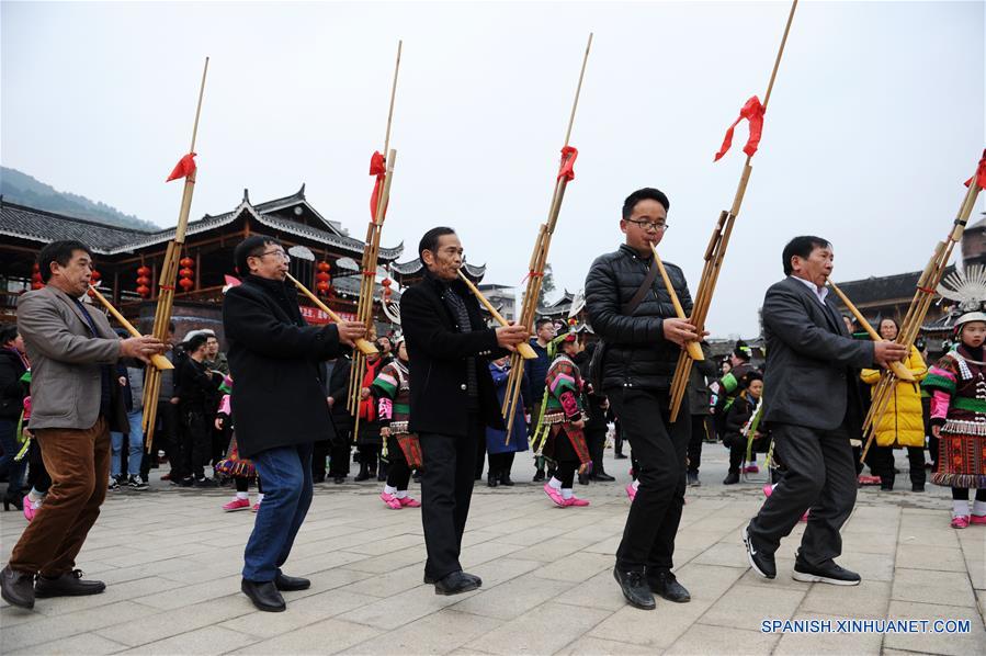 GUIZHOU, febrero 24, 2019 (Xinhua) -- Personas del grupo étnico miao tocan el lusheng durante la celebración del Gannangxiang en la aldea de Zhouxi, ciudad de Kali, provincia de Guizhou, en el suroeste de China, el 24 de febrero de 2019. Ni?as del grupo étnico miao portando atuendos bordados y ornamentos de plata, cantan y bailan al ritmo del lusheng, un instrumento de tubo de ca?a, para pedir por la buena fortuna. Las personas del grupo étnico miao se reúnen en Gannangxiang para el festejo anual del Gannangxiang, una de las celebraciones de lusheng más grandes y primitivas en la provincia de Guizhou. (Xinhua/Yang Wenbin)