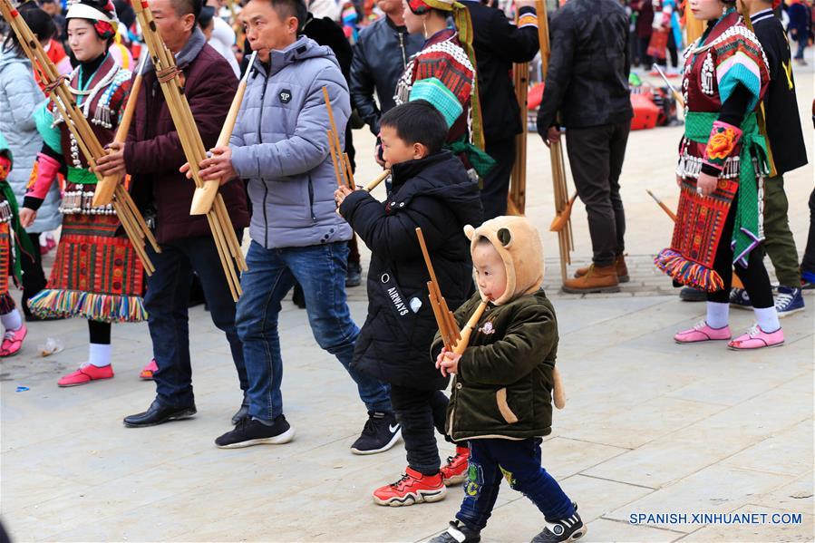 GUIZHOU, febrero 24, 2019 (Xinhua) -- Ni?os del grupo étnico miao tocan el lusheng durante la celebración del Gannangxiang en la aldea de Zhouxi, ciudad de Kali, provincia de Guizhou, en el suroeste de China, el 24 de febrero de 2019. Ni?as del grupo étnico miao portando atuendos bordados y ornamentos de plata, cantan y bailan al ritmo del lusheng, un instrumento de tubo de ca?a, para pedir por la buena fortuna. Las personas del grupo étnico miao se reúnen en Gannangxiang para el festejo anual del Gannangxiang, una de las celebraciones de lusheng más grandes y primitivas en la provincia de Guizhou. (Xinhua/Wu Jibin)