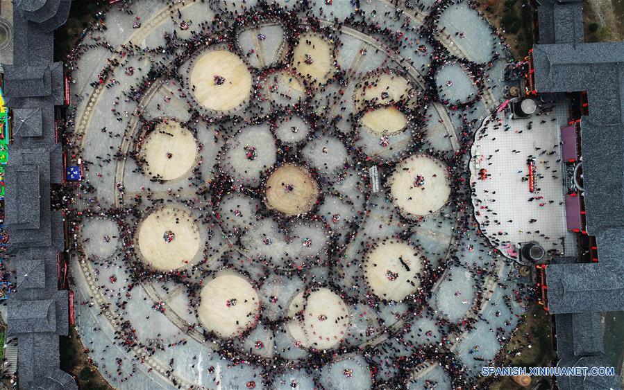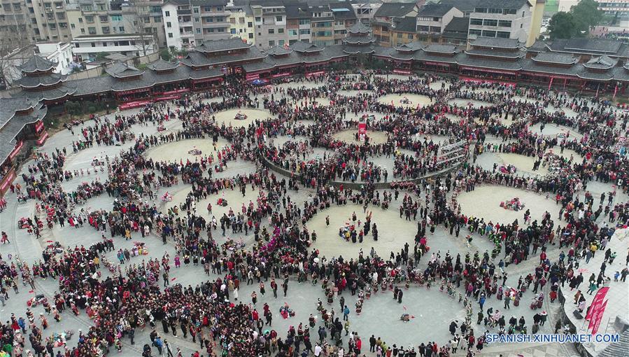 GUIZHOU, febrero 24, 2019 (Xinhua) -- Vista aérea de personas del grupo étnico miao realizando la danza del lusheng en la aldea de Zhouxi, ciudad de Kali, provincia de Guizhou, en el suroeste de China, el 24 de febrero de 2019. Ni?as del grupo étnico miao portando atuendos bordados y ornamentos de plata, cantan y bailan al ritmo del lusheng, un instrumento de tubo de ca?a, para pedir por la buena fortuna. Las personas del grupo étnico miao se reúnen en Gannangxiang para el festejo anual del Gannangxiang, una de las celebraciones de lusheng más grandes y primitivas en la provincia de Guizhou. (Xinhua/Yang Wenbin)