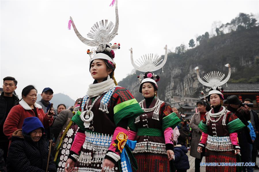 GUIZHOU, febrero 24, 2019 (Xinhua) -- Residentes en vestimentas tradicionales realizan la danza del lusheng en la aldea de Zhouxi, ciudad de Kali, provincia de Guizhou, en el suroeste de China, el 24 de febrero de 2019. Ni?as del grupo étnico miao portando atuendos bordados y ornamentos de plata, cantan y bailan al ritmo del lusheng, un instrumento de tubo de ca?a, para pedir por la buena fortuna. Las personas del grupo étnico miao se reúnen en Gannangxiang para el festejo anual del Gannangxiang, una de las celebraciones de lusheng más grandes y primitivas en la provincia de Guizhou. (Xinhua/Wu Jibin)