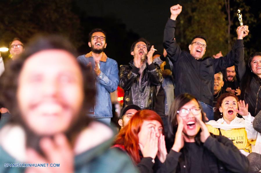 CIUDAD DE MEXICO, febrero 24, 2019 (Xinhua) -- Personas reaccionan durante una transmisión en vivo de la 91 edición de los Premios de la Academia de las Artes y las Ciencias Cinematográficas, en la Plaza Río de Janeiro, en la colonia Roma, en la Ciudad de México, capital de México, el 24 de febrero de 2019. De acuerdo con información de la prensa local, el director de cine mexicano, Alfonso Cuarón, ganó los premios Oscar en las categorías "Mejor Cinematografía", "Mejor Película Extranjera" y "Mejor Director"por la película "Roma". (Xinhua/Francisco Ca?edo)