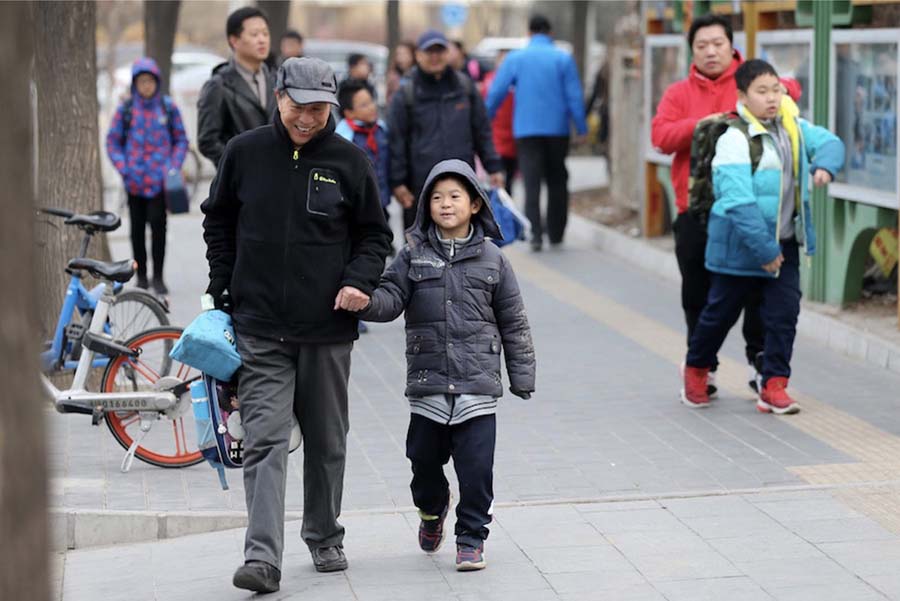 Un padre acompa?a a su hijo a la Escuela Primaria Experimental Huajadi en Beijing el 25 de febrero de 2019. [Foto por Wang Zhuangfei / chinadaily.com.cn]