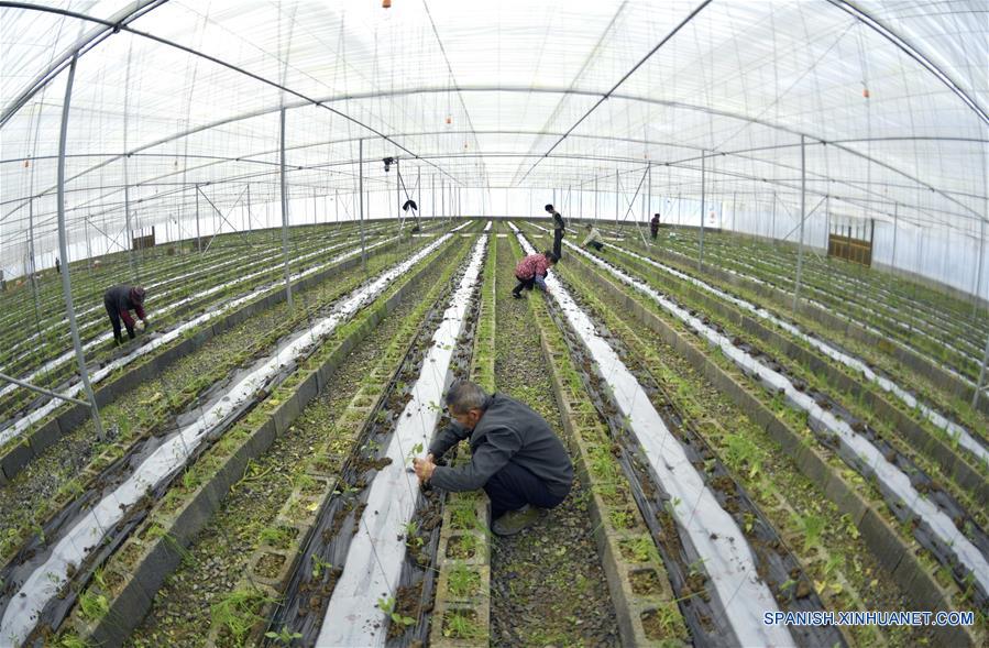 HUBEI, febrero 25, 2019 (Xinhua) -- Agricultores trabajan en un invernadero, en el condado de Xuan'en, en la provincia de Hubei, en el centro de China, el 25 de febrero de 2019. Los granjeros se encuentran ocupados con las labores agrícolas durante el inicio de la primavera. (Xinhua/Song Wen)