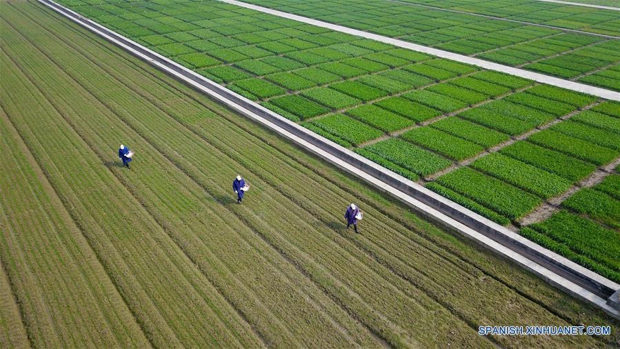 JIANGSU, febrero 25, 2019 (Xinhua) -- Imagen aérea de agricultores trabajando en un campo, en el área de Lixiahe, en Yangzhou, en la provincia de Jiangsu, en el este de China, el 25 de febrero de 2019. Los granjeros se encuentran ocupados con las labores agrícolas durante el inicio de la primavera. (Xinhua/Meng Delong)