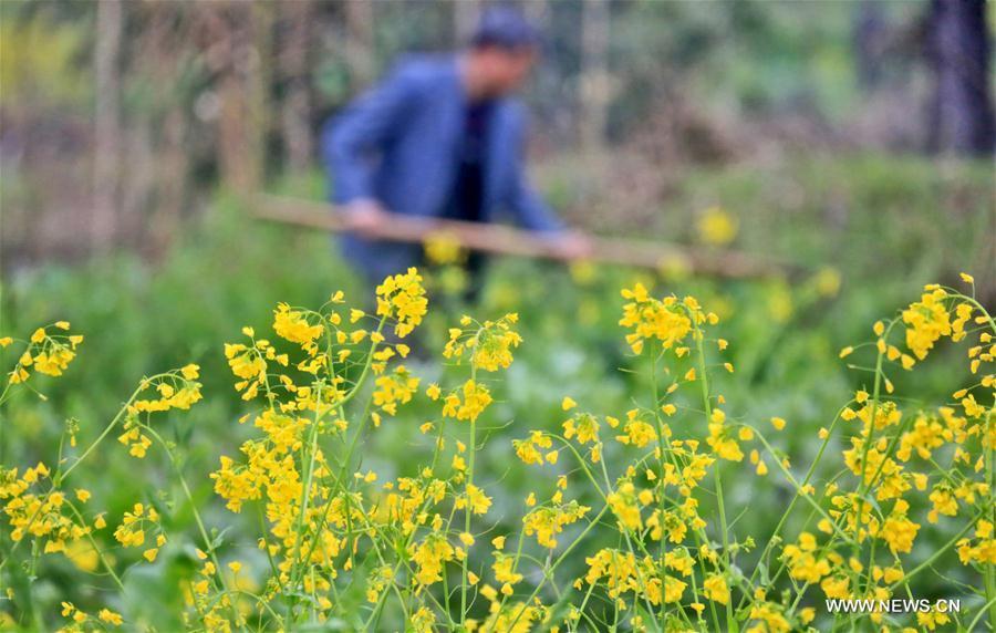 Un agricultor trabaja en el campo junto a las flores de colza en el pueblo autónomo de Longteng en el condado autónomo Mulao de Luocheng, región autónoma Zhuang de Guangxi, sur de China, el 26 de febrero de 2019. (Xinhua / Meng Zengshi)