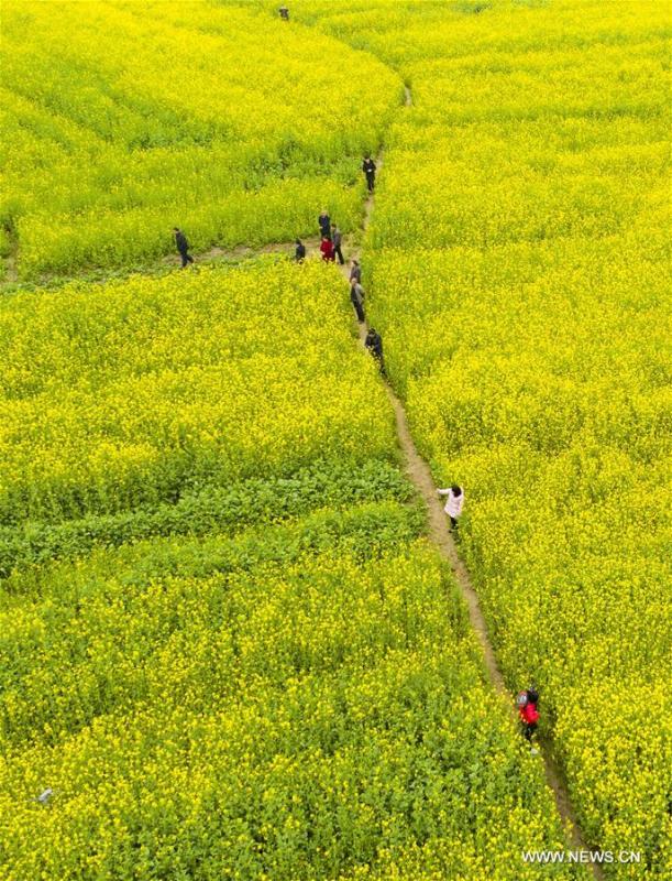 Imagen aérea muestra a varios turistas paseando por un campo lleno de flores de colza en el pueblo autónomo de Longteng en el condado autónomo Mulao de Luocheng, región autónoma Zhuang de Guangxi, sur de China, el 26 de febrero de 2019. (Xinhua / Meng Zengshi)