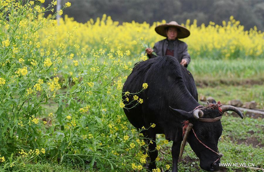 Guangxi, 01/03/2019(El Pueblo en Línea) - Un agricultor trabaja en el campo junto a las flores de colza en el pueblo autónomo de Longteng en el condado autónomo Mulao de Luocheng, región autónoma Zhuang de Guangxi, sur de China, el 26 de febrero de 2019. (Xinhua / Meng Zengshi)