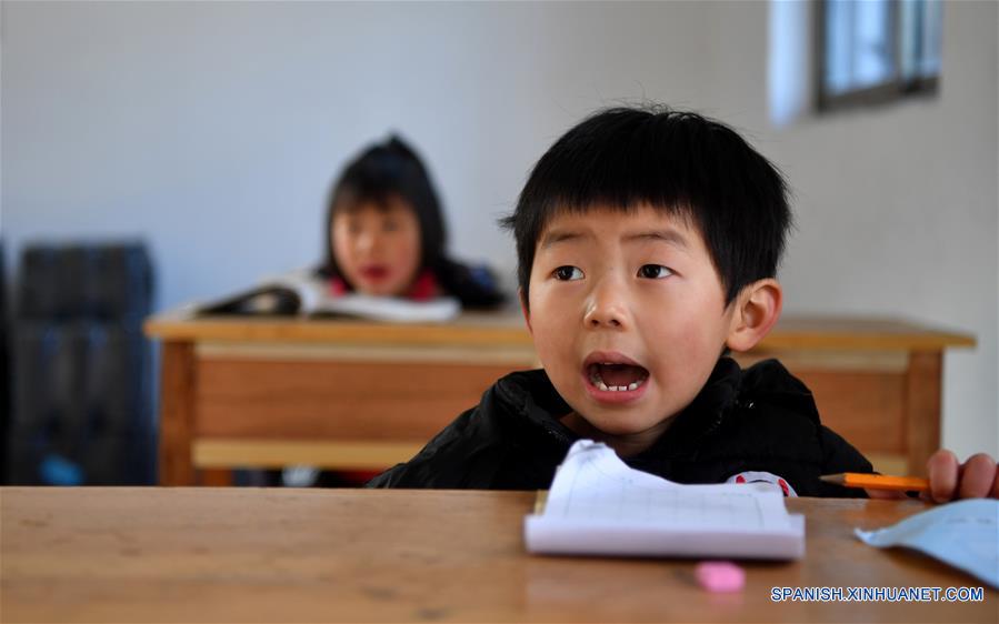 Imagen del 28 de febrero de 2019 de estudiantes participando en una clase en la villa Huashan, en el condado de Yiyang, en la provincia de Henan, en el centro de China. En a?os recientes, mientras los residentes se han mudado gradualmente fuera del área monta?osa, solo quedan un profesor y tres estudiantes en la villa Huashan para el nuevo semestre de 2019. Kong Wenqing, quien se ha comprometido con la carrera de la ense?anza por 36 a?os, esta a cargo de casi todos los asuntos incluyendo administración, contabilidad, cocina y limpieza de la escuela. El profesor abandonó la oportunidad de ser director en otra escuela en el a?o 2006 y escogió continuar ense?ando en la villa Huashan porque cree que los estudiantes aquí lo necesitan más. A pesar de sólo queda un peque?o número de estudiantes, Kong Wenqing no escatima en esfuerzos para darles tutoría. Ha alcanzado la edad de retiro, pero pretende ser recontratado y continuar ense?ando mientras aún haya ni?os en edad escolar. (Xinhua/Li Jianan)