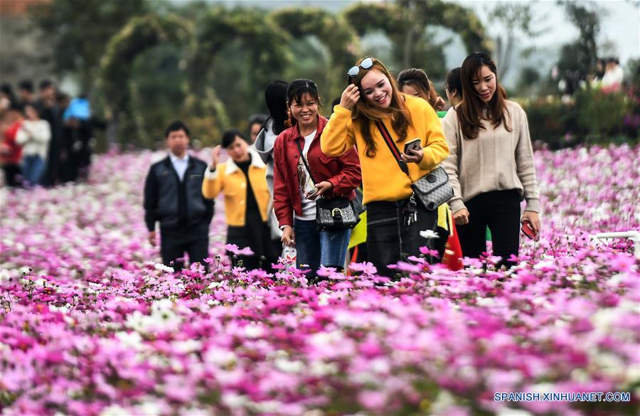 Imagen del 28 de febrero de 2019 de turistas observando las flores de Gesang, en Qinzhou, en la Región Autónoma Zhuang de Guangxi, en el sur de China. Las flores de Gesang, también llamadas flores de la felicidad, han entrado en la temporada de floración recientemente en Qinzhou. (Xinhua/Zhang Ailin)
