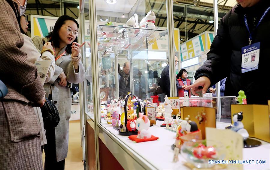 Visitantes observan los objetos expuestos en un estand japonés durante la 29 Feria del Este de China, en Shanghai, en el este China, el 1 de marzo de 2019. La feria comenzó el viernes en Shanghai. (Xinhua/Fang Zhe)