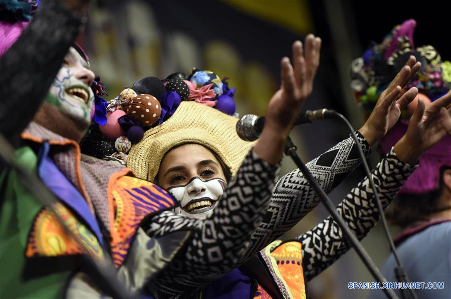 Imagen del 28 de febrero de 2019 de Leticia Tzitzios (d), de 22 a?os de edad, integrante de la murga La Venganza de los Utileros, participando durante una actuación en un tablado, en Montevideo, capital de Uruguay. Las murgas son agrupaciones que practican un género coral-teatral-musical y que participan en el Carnaval uruguayo desfilando o ancladas en un mismo lugar, y que suelen componerse por un coro de entre 13 y 17 personas con el acompa?amiento musical de bombo, platillos y redoblante. De 20 murgas que participan en el concurso oficial este a?o, siete tienen integrantes mujeres, mientras que de casi 350 murguistas en total, solo 13 son mujeres. Leticia es componente y letrista de la murga, estudia en la Facultad de Ciencias Económicas, y también juega fútbol. Su puesto en la murga La Venganza de los Utileros es de "sobreprima" y también escribió la letra de la retirada de la murga en la que participa este a?o. Los diferentes actores del carnaval visualizan la necesidad de repensar el espacio que ocupa hoy la mujer. No obstante, hoy en día continúa siendo un género machista, donde espectadores y artistas valoran más la voz masculina, aunque, cada vez son más las mujeres y hombres que persiguen un carnaval más igualitario. (Xinhua/Nicolás Celaya)